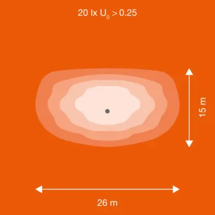 Questa lampada LED viene spesso usata per illuminare in modo ottimale aree piuttosto grandi. A questo scopo, serve un apparecchio che abbia alto rendimento luminoso in quanto maggiore è il rendimento luminoso, più grande è la superficie illuminata. Questo apparecchio emette una luce con potenza luminosa di 10550 lm e il rapporto lumen/watt di efficienza luminosa è di lm/W. Questo significa che l'apparecchio consuma poca energia per la quantità di luce che genera!