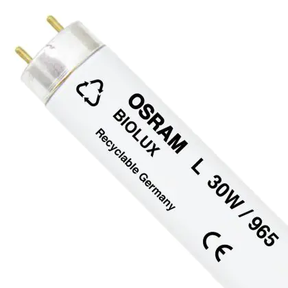 I Osram Biolux T8 30W - 965 Luce del Giorno | 90cm sono i tubi più comuni e tra le lampade più vendute nel mondo. Questi tubi T8 (TL-D per Philips) hanno una lunghezza la quale corrisponde alla potenza di 30W.