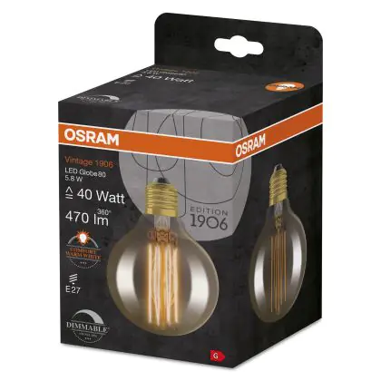 La Osram Vintage 1906 LED E27 Globe Filament Gold 80mm 5.8W 470lm - 822 Extra Warm White | Dimmable è la perfetta sostituzione per la tua lampada convenzionale 40W con attacco E27 grazie alla sua tecnologia LED. Passare a LED ti offrirà tanti vantaggi!