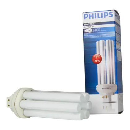 Le Philips PL-T TOP 32W 840 4P (MASTER) sono lampade fluorescenti compatte con contenuto di mercurio basso dotate di attacco GX24q-3 a 4 pin (perni). La potenza di queste lampade fluorescenti é pari a 32W. Quando decidi di sostituire le tue vecchie lampade fluorescenti compatte, assicurati di mantenere medesimo attacco, numero di pin (perni) e stessa potenza: in questo modo non avrai problemi nell'installazione. I vantaggi di tali lampade sono diversi: in particolare, presentano una vita lunga (13.000 ore in media) e sono altamente efficienti. La temperatura di colore di queste lampade é di 4000K, il che corrisponde ad una luce bianca fredda. L'indice di resa cromatica si pone nell'intervallo di 80-89Ra. Tali lampade fluorescenti compatte sono in classe efficienza energetica 'B' .