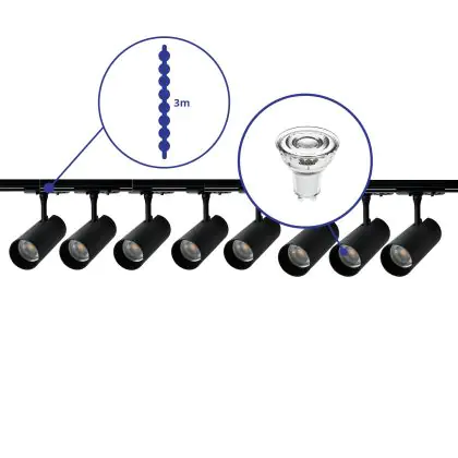 Descrizione Set completo 1-Fase Rail 3 Metro Nero | incl. 8x Faretti + GU10 2700K 3W Dimmerabile + Tappo Di Chiusura, Connettore di Alimentazione e I-Connettore