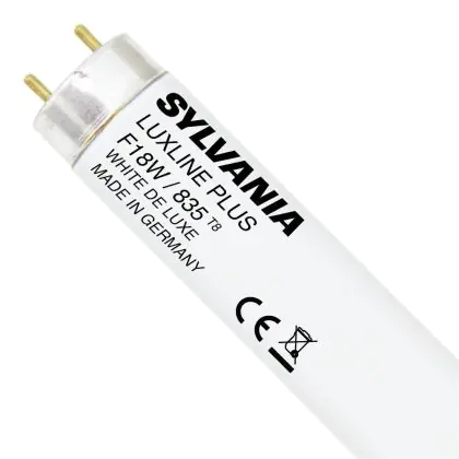 I Sylvania Luxline Plus T8 18W - 835 Luce Calda | 60cm sono i tubi più comuni e tra le lampade più vendute nel mondo. Questi tubi T8 (TL-D per Philips) hanno una lunghezza la quale corrisponde alla potenza di 18W.